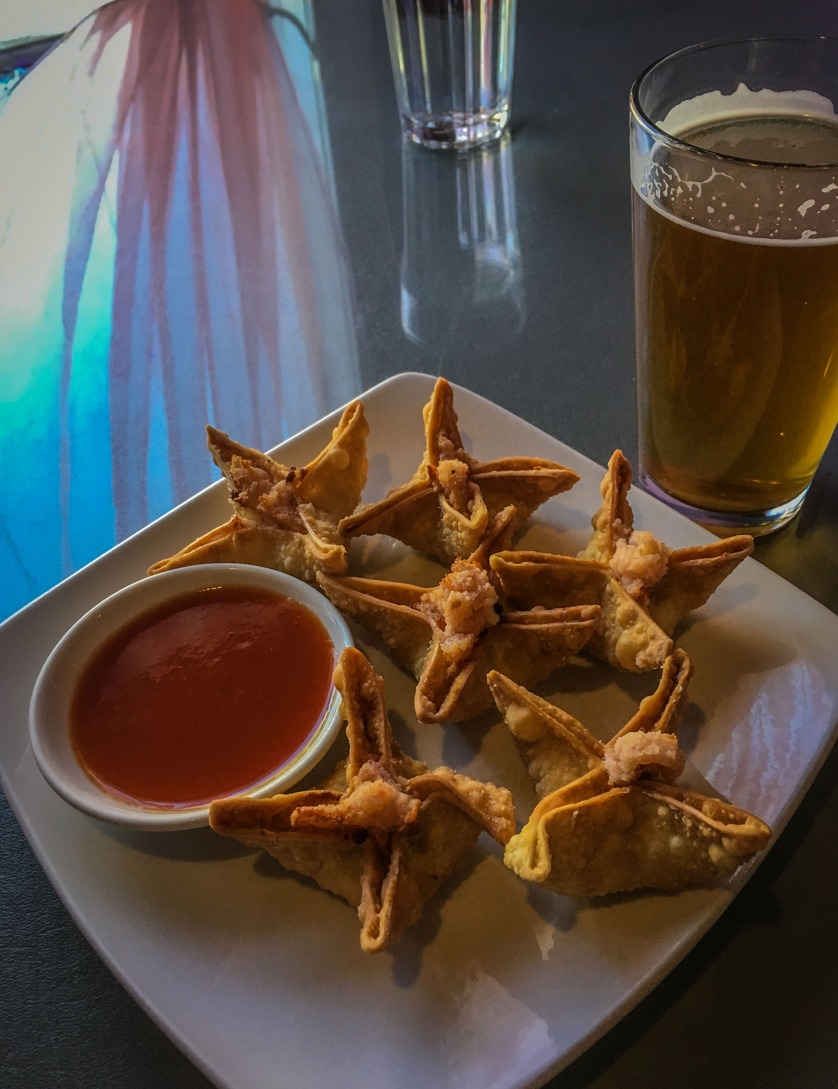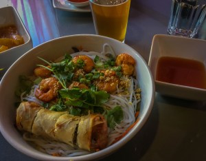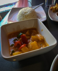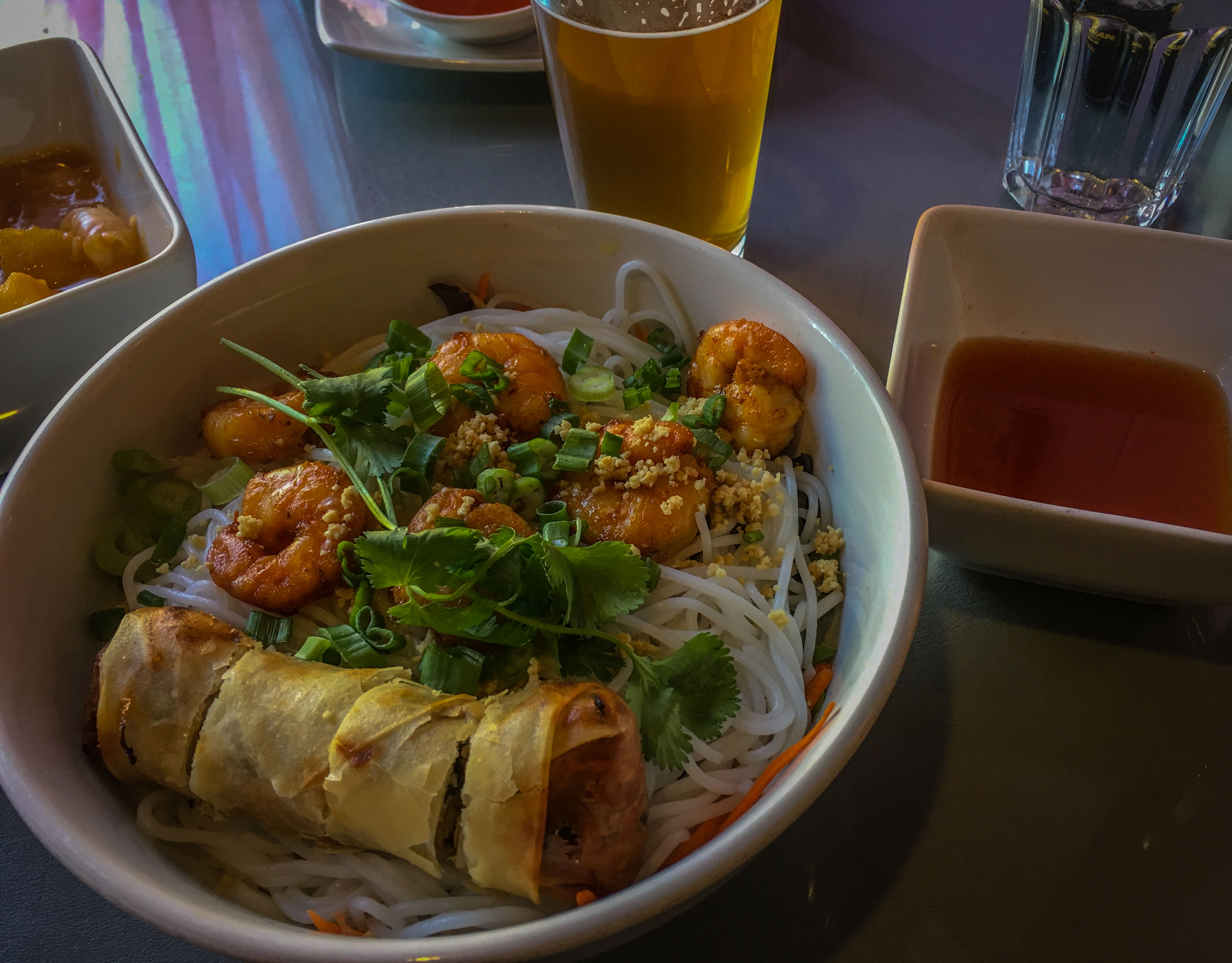 We were a bit worried when we arrived since the restaurant was pretty empty – but then we were still living in the Central time zone. We were seated quickly and not long after, a family arrived that spoke to the host in their native language. Always a good sign in my opinion. The menu was divided into appetizer, curry, noodle, and entree sections. We ordered crab and cheese wontons with homemade wonton sauce for an appetizer. Jean was adventurous and ordered shrimp curry with pineapple and jasmine rice – although she did play it safe on the heat ordering mild and not the Thai hot. Even the mild was pretty spicy, but just perfect in my opinion. I ordered Vietnamese barbecue shrimp, which was traditional Vietnamese grilled herbs, shrimp, and crispy spring rolls, served on Thai rice noodles, lettuce, cucumber, bean sprouts, carrots, spring onions, and mint with sweet and sour chili sauce. I felt clueless, but I had to ask the server how to eat this dish. Fortunately, he was very kind and said I could mix it up as I liked, or eat it in layers.