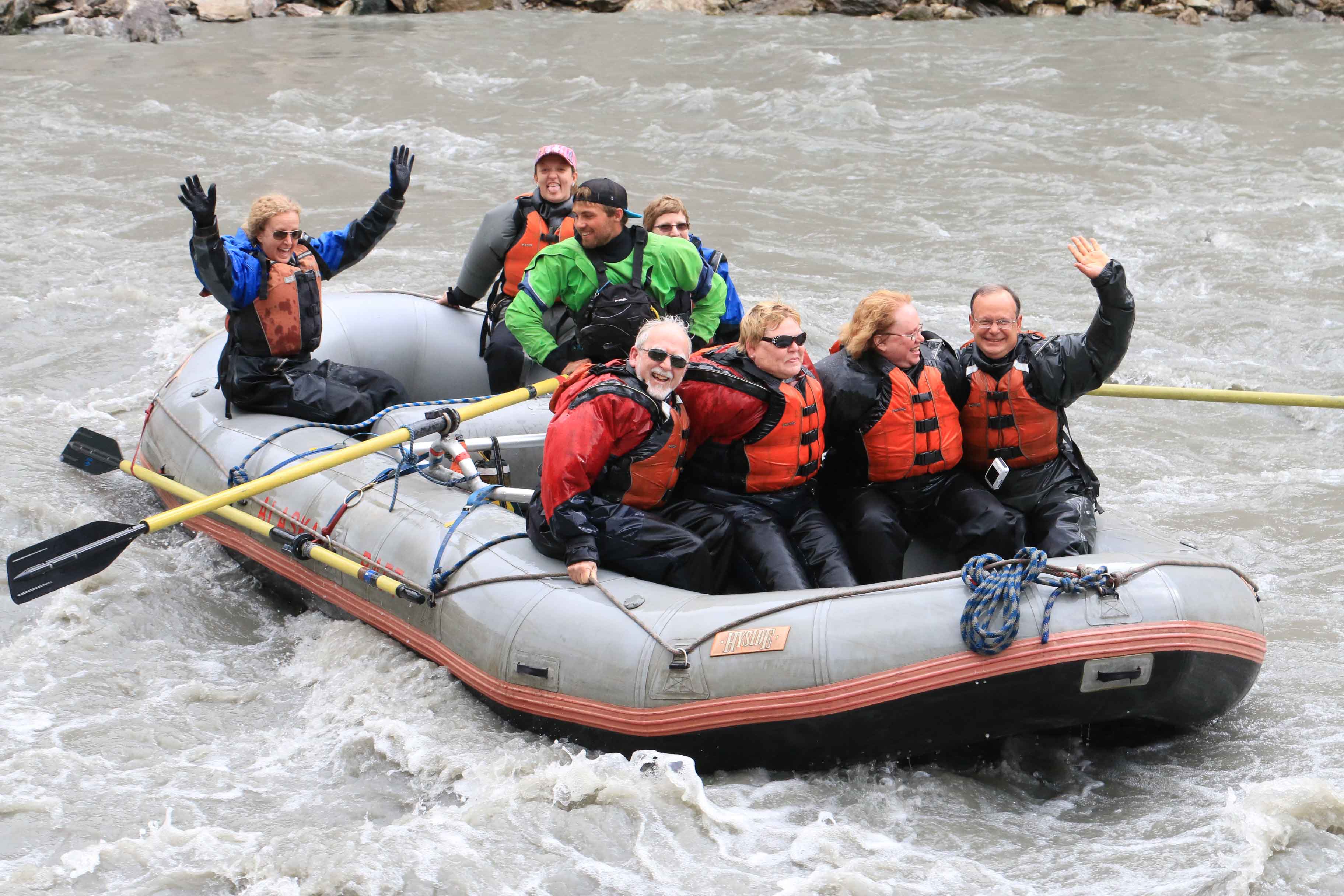 Our last night in Denali, we braved the frigid waters of the Nenana river for my first ever white-water adventure.  We donned dry suits and life jackets and into the raft we went.  We opted for the tour where the guide steers and we just hang on – and fortunately, no one fell out!  Well, until we reached a calm spot near the end where our guide told us we could jump in if we wanted.  I declined that particular opportunity, but Theo and a couple of the other passengers hopped right in.  I pulled Theo back in the raft after he had had enough, although I was laughing so hard by that time I am surprised I did not drown him!